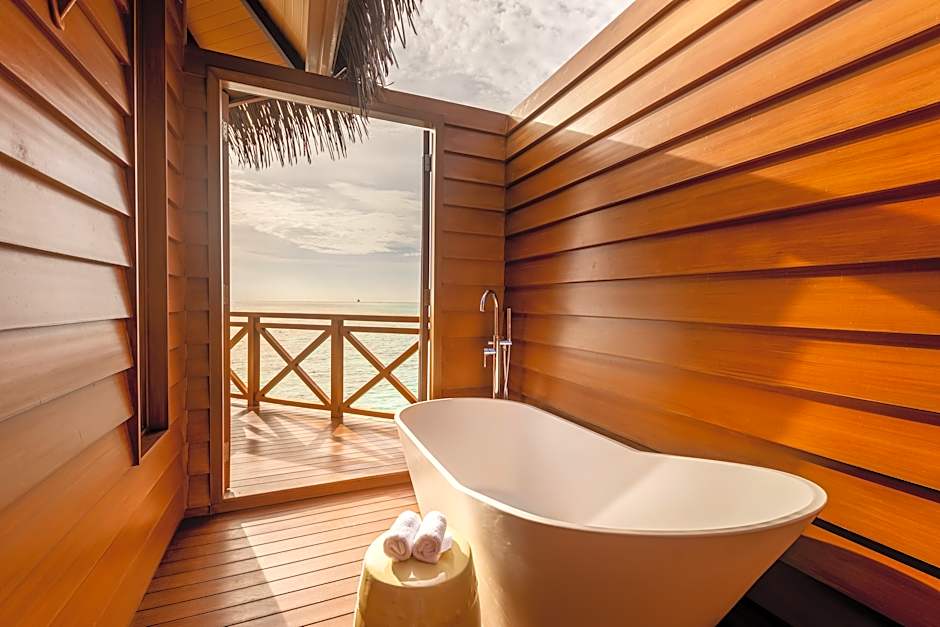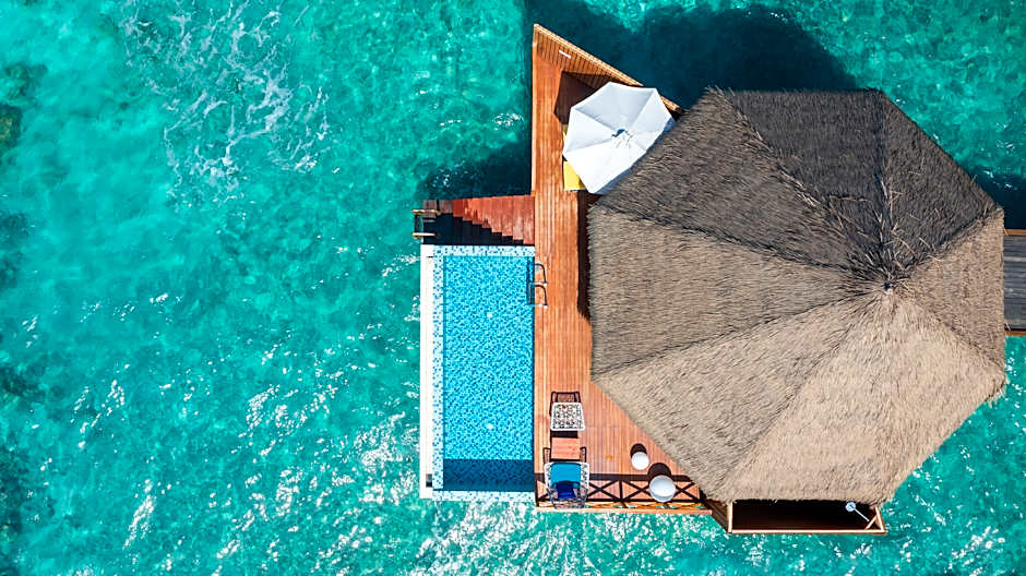 Over Water Reef Pool Villa is 872 square feet and includes a king-size bed 150-183 width and is Wheelchair-accessible.